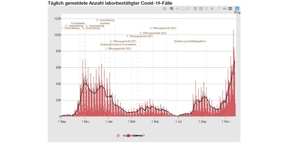 Auf 100'000 Einwohnerinnen und Einwohner wurden in den vergangenen zwei Wochen 1107,76 laborbestätigte Coronavirus-Infektionen gemeldet. Die Reproduktionszahl R, die angibt, wie viele Personen eine infizierte Person im Durchschnitt ansteckt, lag am 19. November bei 1,27.