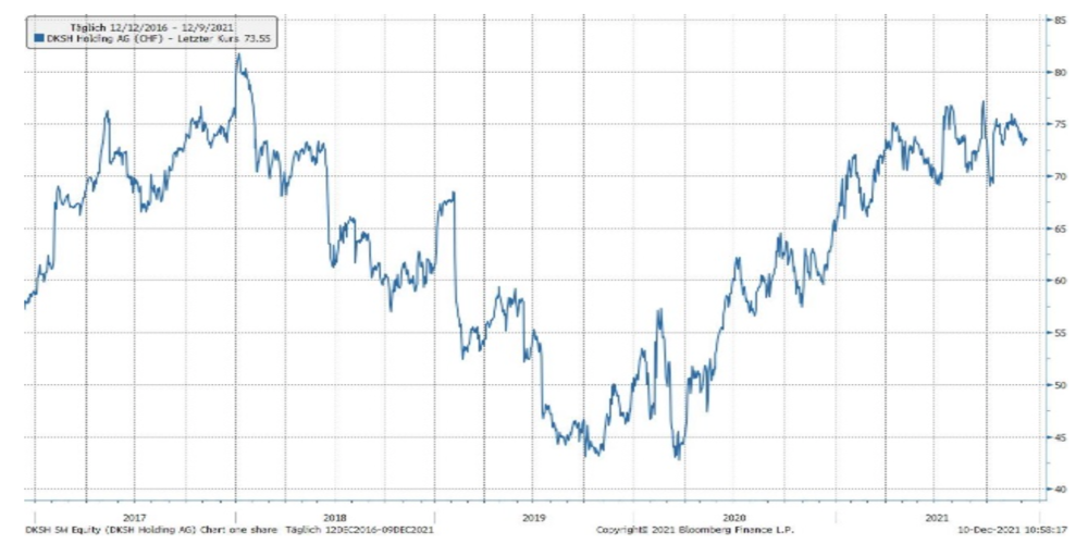Kurs am 09.12.2021 CHF 73.55; 52 Wo Hoch/Tief CHF 77.95/61.80; Valor 12.667.353; Geschätztes KGV 22: 22.93x; Dividendenrendite ca. 2.92%.