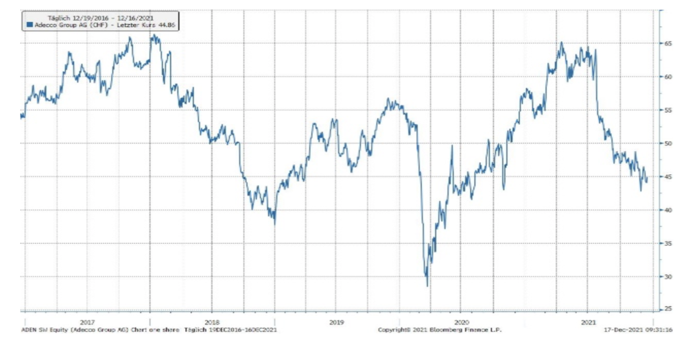 «Adecco vermittelt als Personaldienstleister Arbeitsplätze zwischen Arbeitgebern und Arbeitnehmern und ist in über 60 Ländern vertreten. Adecco ist im dritten Quartal 2021 gewachsen und hat sich damit weiter vom Corona-Einbruch erholt. Die Lieferengpässe sind allerdings auch für den Personaldienstleister eine gewisse Belastung. Der Umsatz nahm um 8% auf EUR 5.22 Mrd. zu. Der aktuelle Quartalsumsatz liegt noch gut 10% unter jenem des dritten Quartals 2019, also vor Corona.