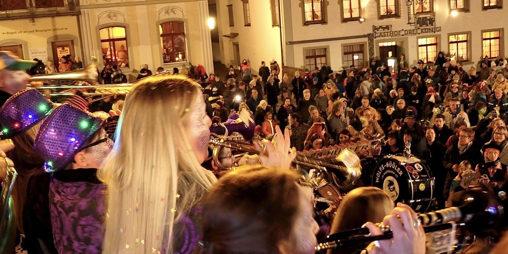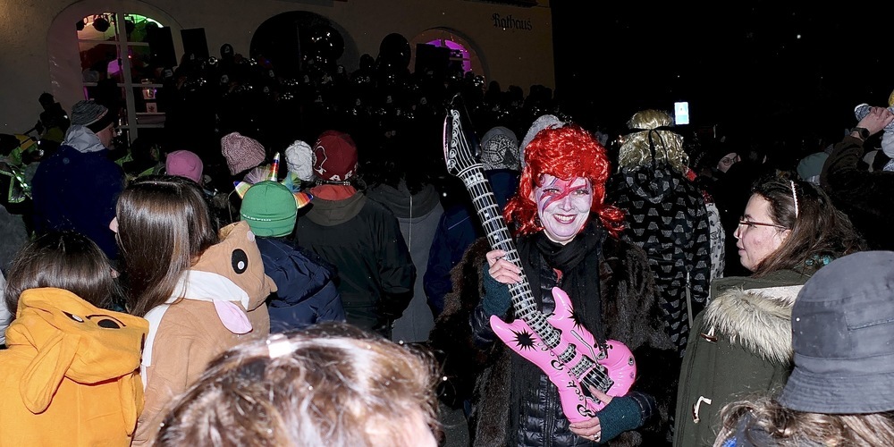 Bis weit vom Platz vor dem Rathaus in Berneck entfernt waren am Freitagabend, die Guggen zu hören. Start des «Guggenmönsterli» war aber mysteriöserweise nicht Punkt 18:37 Uhr, am traditionellen Startzeitpunkt für den „Karneval zu Bernang“, sondern erst um 19.30 Uhr. Auch kamen die Guggen nicht, anders als in anderen Jahren, mit lautem Tschinderassa und Humptata aus Richtung Heerbrugg die Neugass herauf. Sondern warteten geduldig auf ihren Auftritt auf dem Rathausplatz, wo sie ganz unspektakulär die Bühne erklommen.