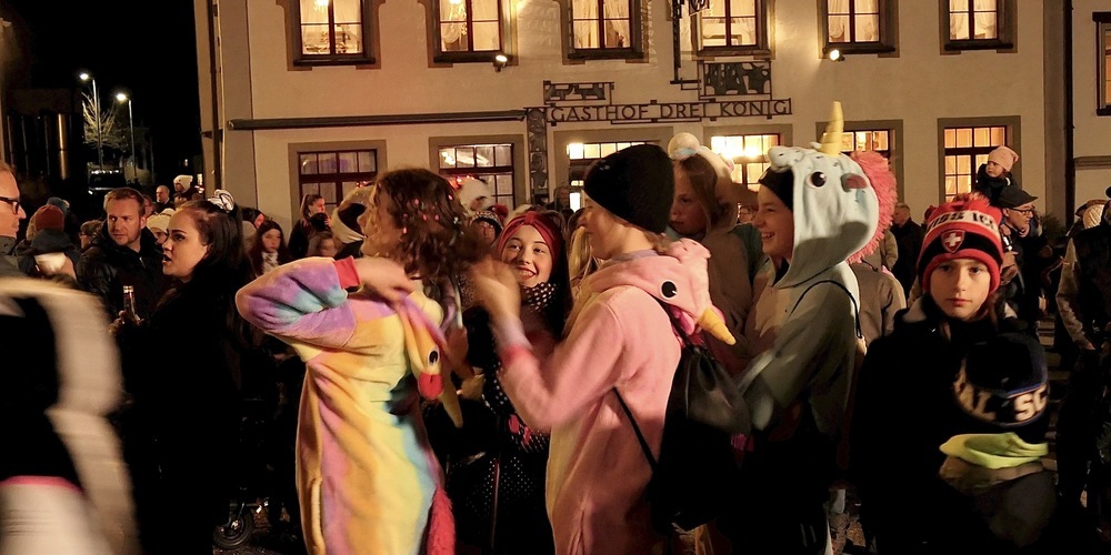 Acht Gruppen in ihren fantasievollen und aufwändig gefertigten Kostümen veranstalteten so nacheinander eine musikalische Kakophonie, als sie ihren typischen Sound durch die Strassen des sonst so beschaulichen Dörfchens Berneck hallen liessen.
