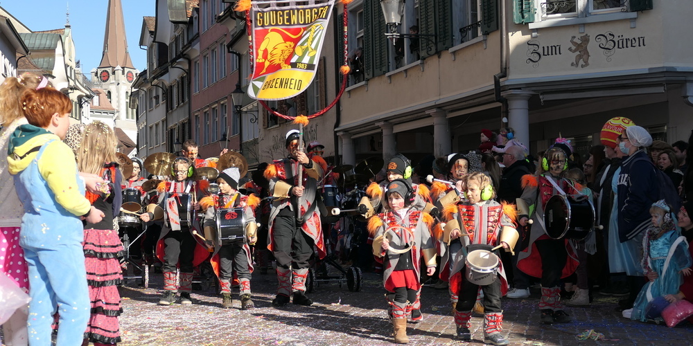 Vor allem die Jüngsten waren von ihren stolzen Muttis härzig verkleidet worden. Und freuten sich über das Geschehen. Über die harmlose Konfettiwerferei, über die lustigen Verkleidungen der Guggen und sogar über die Häxa, brachten diese hässlichen verbuckelten Gestalten ja sogar Süssigkeiten mit.