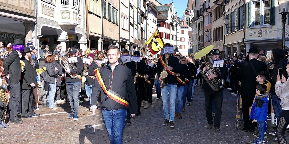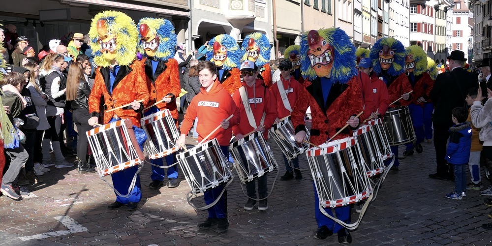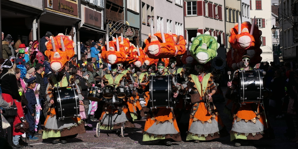 Die erste von zwanzig Guggenmusiken im Umzug waren die Burgtätscher aus Rebstein, die mit ihren Kroko-Köpfen ein prächtiges Bild abgaben. Ebenso prächtig wie die gleich folgenden Städtli-Chläpfer mit ihren Dinoköpfen. Zusammen mit der gleich darauf durch die Altstadt musizierenden Wolfshüüler aus Wolfhalden ergab sich ein vieltöniger Guggenmelodienmix. Nicht unbedingt schön, aber sicher von erlesener Seltenheit.