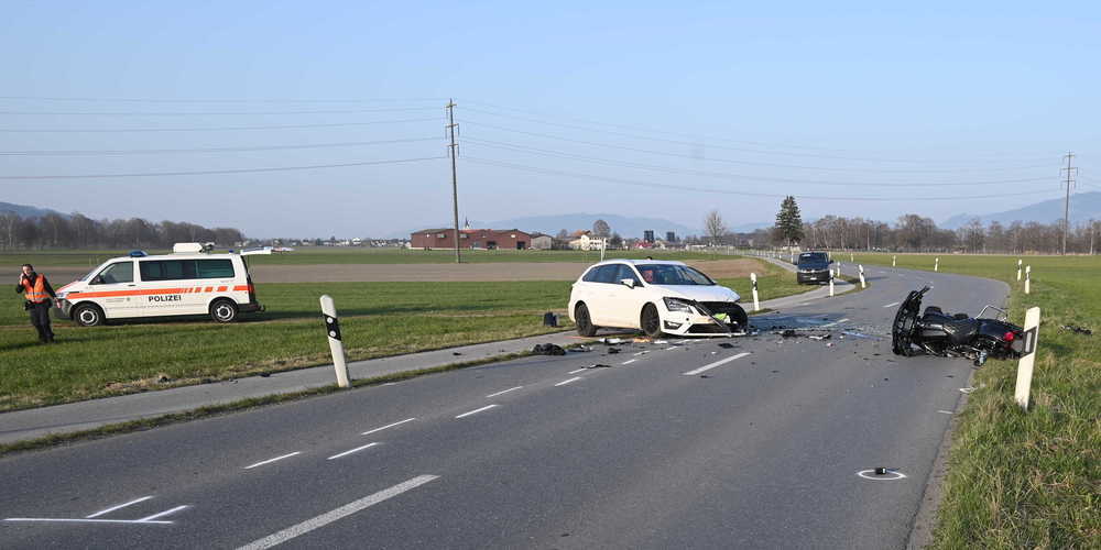 Am Montagnachmittag kollidierte ein Motorrad mit einem Auto. Ein 41-jähriger Motorradfahrer wurde dabei schwer verletzt und musste vom Rettungsdienst betreut und mit der Rega ins Spital gebracht werden.