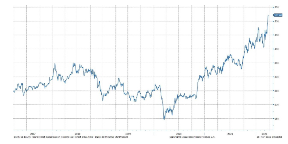 Kurs am 24.03.2022 CHF 516.00;  52 Wo Hoch/Tief CHF 520.00/312.00; Valor 2.553.602; Geschätztes KGV 2022: 31.84x; Dividendenrendite ca. 1.54%.