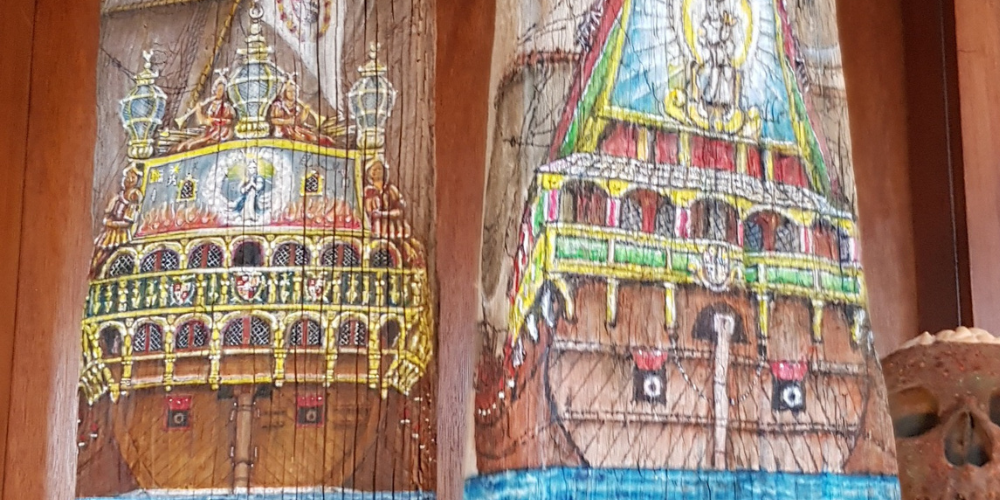 Beim Auffinden von Schwemmholzplanken und Balken im Rheindelta und am Meer erinnert sich Urs Koller an die historischen Schönheiten der Seefahrt. Das damals von Kunsthandwerkern gestaltete Heck dieser Schiffe hat es dem Airbrush-Artisten besonders angetan.