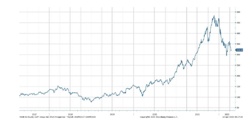 «VAT ist ein global führendes Unternehmen in der Entwicklung und der Produktion von Vakuumventilen, Mehrventilmodulen und Metallbälgen. Die Aufträge der VAT Gruppe stiegen im 1. Quartal 2022 im Vergleich zum Vorjahr um 22% auf CHF 294. Mio. Der Nettoumsatz stieg auf CHF 263 Mio., was ein Anstieg von 37% gegenüber dem Vorjahr entspricht. Die Aussichten für die nächsten Jahre bleiben sehr gut. Für das Jahr 2025 hat VAT das Umsatzziel von CHF 1.1 Mrd. auf CHF 1.5 Mrd. erhöht. Konzernchef Mike Allison erwartet bereits im laufenden Jahr ein Wachstum von +20%.