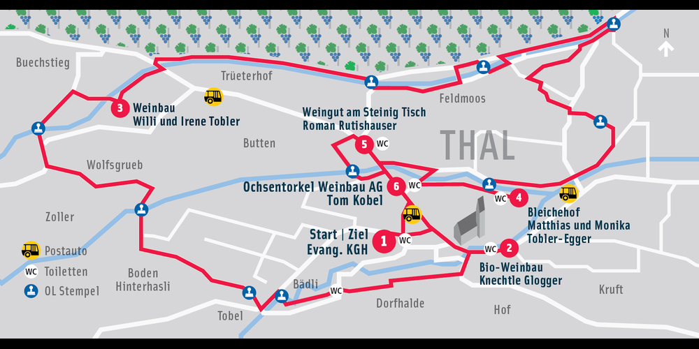 Fünf Winzer (Bio-Weinbau Knechtle Glogger, Weinbau Willi und Irene Tobler, Matthias und Monika Tobler-Egger vom Bleichehof, Roman Rutishauser vom Weingut am Steinig Tisch und Tom Kobel vom Ochsentorkel) sowie fünf Vereine (Trachtenchörli, Päckliwerfer-Verein, Feldschützen Thal, SpitzenKochBanausen und Vollmondverein) machen mit. Sie verwöhnen die Teilnehmerinnen und Teilnehmer – an verschiedenen Stellen entlang eines empfohlenen Wegs rund um den Dorfkern – mit ihren Weinen und einem kulinarischen Angebot.