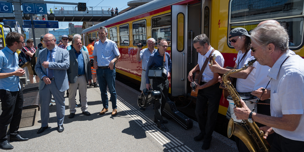 Landesrat Zadra reiste am Samstag im Nostalgiezug gemeinsam mit Lustenaus Bürgermeister Kurt Fischer und anderen von Lustenau nach St. Margrethen. Dort wurde die Vorarlberger Delegation von Regierungsrat Beat Tinner, Gemeindepräsident St. Margrethen Reto Friedauer und Thurbo Unternehmensleiterin Claudia Bossert in Empfang genommen.