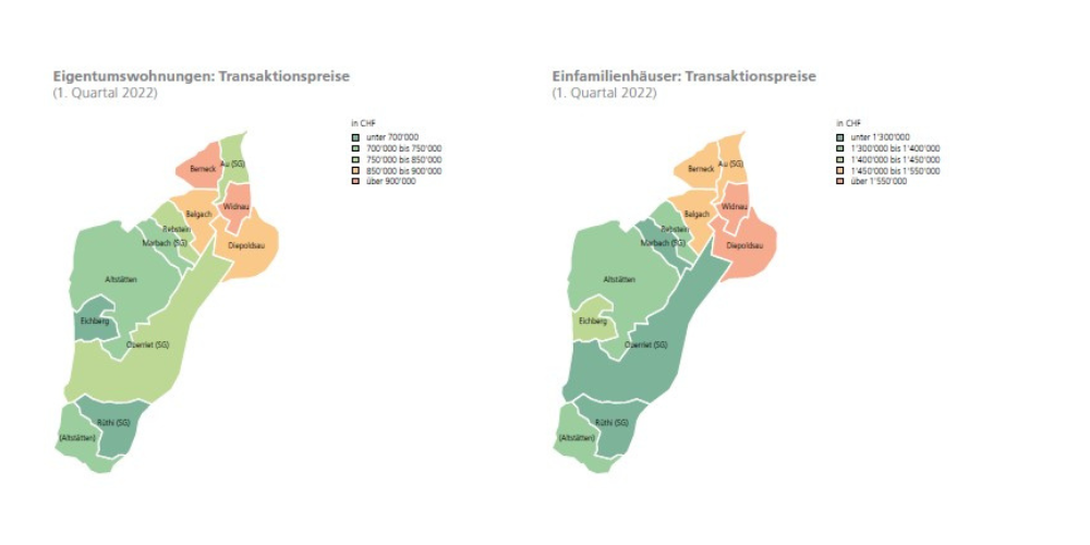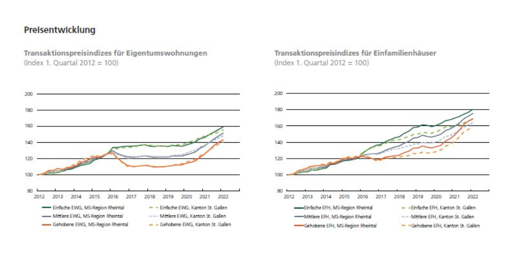 Die Kombination eines spärlichen Angebots und einer rasch zunehmenden Nachfrage führte beim Handel mit Wohneigentum im vergangenen Halbjahr wieder zu bemerkenswerten Preisanstiegen. So resultierte im Rheintal zwischen dem 1. Quartal 2021 und dem 1. Quartal 2022 ein Anstieg von 10.0 Prozent bei den mittelgrossen Einfamilienhäusern und gar ein Plus von 11.6 Prozent bei den mittelgrossen Eigentumswohnungen.