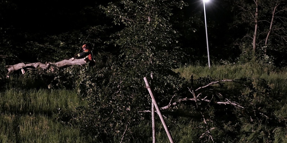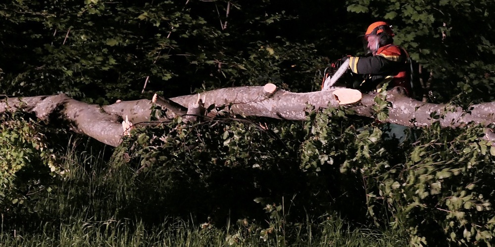 Nach der Aufnahme der Situation verschwinden die Florianijünger wieder. Aber nur um wenige Minuten später mit schwerem Gerät zurückzukehren. Mit Flutlicht, das die Stelle mit dem dicken Baumstamm mitten über der Strasse taghell erleuchtet. Und mit Motorsägen.
