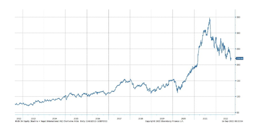 «Kühne + Nagel ist eines der weltweit grössten Transportunternehmen. In See- und Luftfracht sind die Schweizer mittlerweile die Nummer 1. Im 1. Halbjahr 2022 konnten trotz der globalen Herausforderungen positive Ergebnisse erzielt worden. So stieg der Nettoumsatz um 55% auf CHF 20.6 Mrd., der Gewinn sogar um 113% auf CHF 1.6 Mrd. Die Steigerungen kommen aus allen vier grossen Geschäftsfeldern, wobei die Seefracht mit einem Umsatzplus von 88% die grösste Steigerung auswies. Der Free Cashflow liegt nun bei CHF 1.711 Mrd., was einem Plus von 304% entspricht. Kühne + Nagel hat mit dem Ergebnis die Analystenerwartungen übertroffen.
