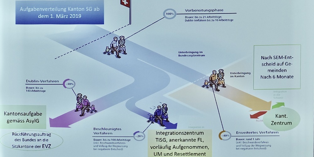 Claudia Nef erläuterte als Geschäftsführerin des Trägervereins Integrationsprojekte St.Gallen TISG dessen Aufgaben und Aktivitäten. Man erfülle im Auftrag aller 77 St.Galler Gemeinden Aufgaben in der Unterbringung, der Betreuung sowie der sozialen und beruflichen Integration von Flüchtlingen. Rund 120 Mitarbeitende im ganzen Kanton engagieren sich für eine nachhaltige Integration.