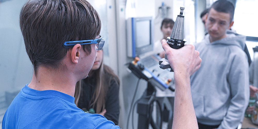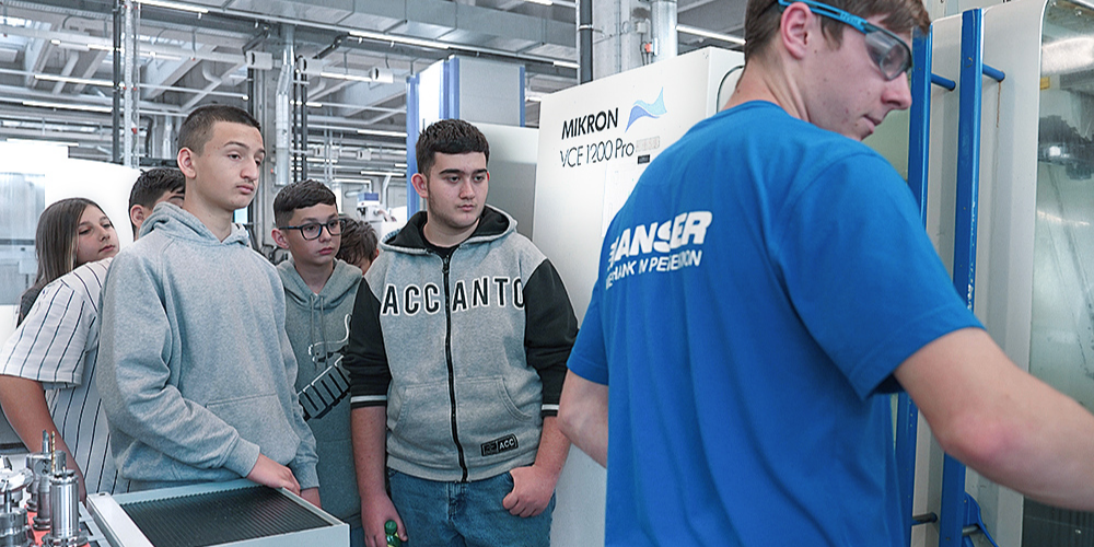 Um einen vertieften Einblick in das Berufsleben bei der August Manser AG zu ermöglichen, wurde die Gruppe nun aufgeteilt und Führungen durch die Bereiche CNC-Drehen, CNC-Fräsen, CAM-Programmieren sowie Montage gegeben.