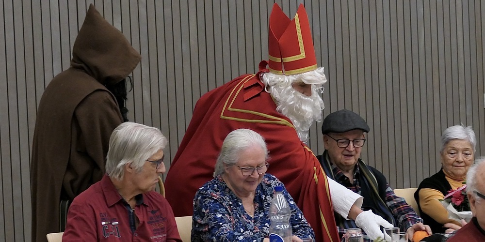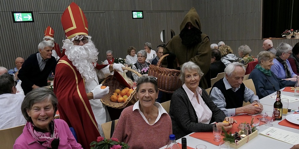 Nach Kaffee und Kuchen, Fleischkäse und Kartoffelsalat, gekocht, angerichtet und serviert von den fleissigen Landfrauen unter der Leitung von Judith Eugster, kam dann auch der Samichlaus zu seinem Auftritt und verteilte Mandarinen und Erdnüsse. Besser gesagt, gleich drei Samichläuse waren mit ihren Schmutzlis erschienen