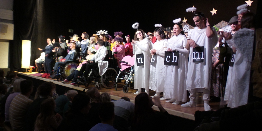 «Ich bin toll» und «Du bist schön» waren das Erste, was die Maschine ausdruckte. Passend für die Darsteller des Abends, lauter Menschen mit teils sogar schwerer Beeinträchtigung, die mit ihren Betreuern die Bühne bevölkerten. Und vor allem beim Schlussapplaus unverfälschte Freude und Begeisterung zeigten. Das eine, alles zusammenfassende Wort wurde dann auch noch gefunden. Unmittelbar nach dem ersten Kuss der Hauptprotagonisten. «Nochmal».