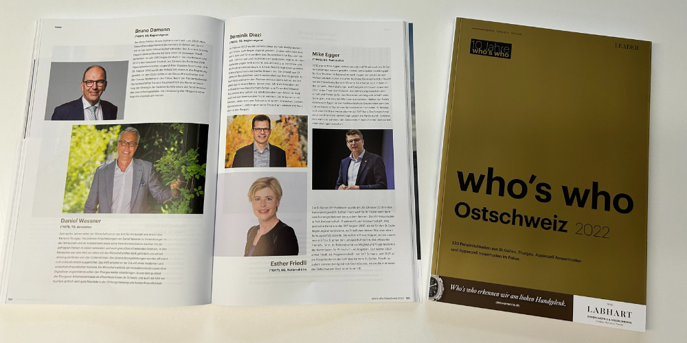 In der gerade erschienenen aktuellen zehnten Ausgabe des «who’s who der Ostschweiz» werden inzwischen über dreihundert Persönlichkeiten aus den Kantonen St.Gallen, Thurgau und beiden Appenzell, die sich um die Ostschweiz besonders verdient gemacht haben, vorgestellt. Sie haben sich durch ihr Wirken wirtschaftlich, politisch, wissenschaftlich, bildungstechnisch oder gastronomisch hervorgetan. Sämtliche bisher porträtierten Ostschweizerinnen und Ostschweizer finden Sie auf dem Onlineportal who-s-who.ch.