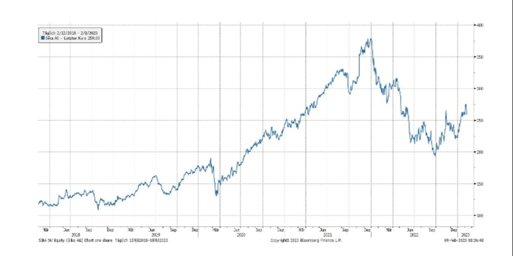 «Sika ist weltweit im Bereich Spezialchemie tätig und in den Sparten Kleben, Dichten, Schützen und Verstärken führend. In 101 Ländern werden in über 300 Fabrikationsstätten 27'000 Mitarbeiter beschäftigt. Am 11.01.2023 hat der Konzern die Umsatzzahlen für das abgelaufene Geschäftsjahr publiziert. Sika konnte den Umsatz trotz schwierigen Umfelds mit nachlassender Baukonjunktur nach 17.1% im Vorjahr um 13.4% auf CHF 10.49 Mrd. steigern, womit erstmals in der Firmengeschichte die Marke von CHF 10 Mrd. überschritten wurde. Das hohe Absatzwachstum ist unter anderem auch auf Preiserhöhungen zurückzuführen.