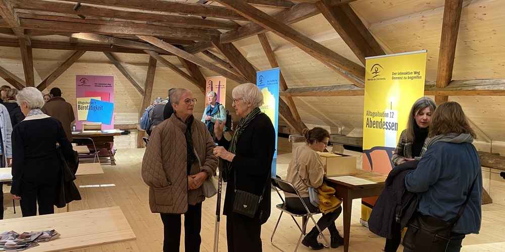 Nach dem Apéro konnten die Gäste an verschiedenen Stationen in der Ausstellung erleben, vor welchen Herausforderungen Menschen mit Demenz im Alltag stehen.