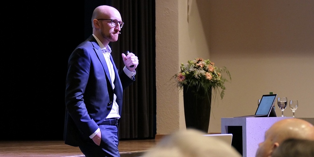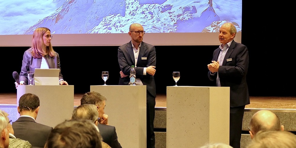 Im ersten Teil erläuterten Thomas Stucki, Leiter Investment Center, und Beat Schiffhauer, Konjunktur- und Finanzexperte, ihre Einschätzungen zur Wirtschaftsentwicklung. Passend illustrierte Thomas Stucki seine Ausführungen mit der Darstellung eines Verkehrsschildes «Achtung Schleudergefahr!», das im Hintergrund eine Winterlandschaft mit etwas Sonnenschein zeigte. Denn die Lage der Wirtschaft sei unsicher und heikel, dennoch sind viele positive Dinge zu sehen.
