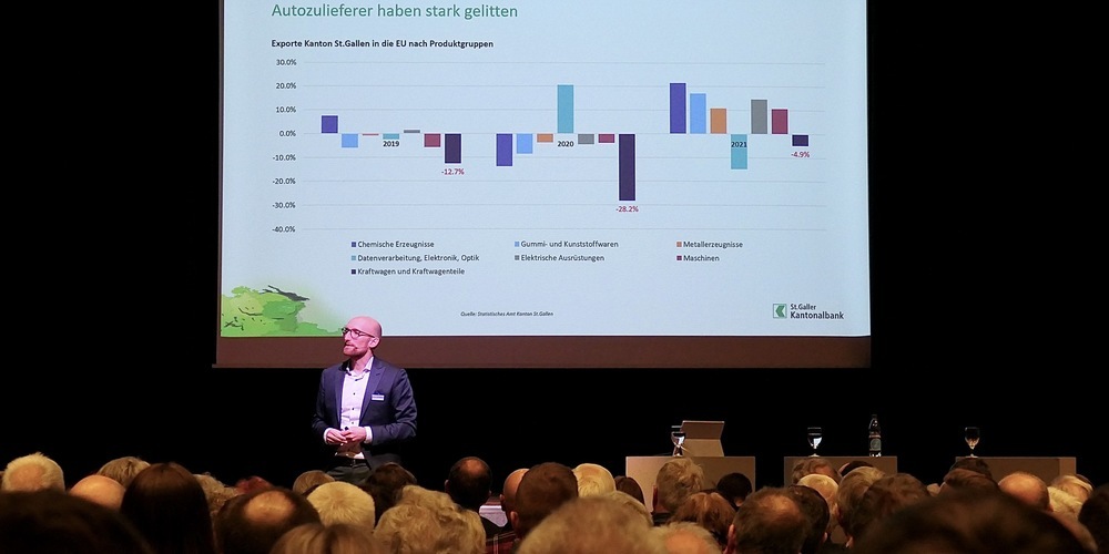 Beat Schiffauer ging in seinem Beitrag näher auf die spezielle Lage der Wirtschaft in der Ostschweiz und im Rheintal ein. Denn gerade im Rheintal sind der Anteil der Industrialisierung und der Exportfokus besonders hoch. «Die Ostschweizer Wirtschaft wird durch die hohe Abhängigkeit von der europäischen Wirtschaft die Abkühlung zu spüren bekommen. Die steigenden Zinsen führen zudem zu einer Zurückhaltung bei den Bauinvestitionen. Die Region Rheintal dürfte aufgrund ihres hohen Anteils an exportorientierten Firmen den Nachfragerückgang aus dem EU-Raum deutlich merken.»