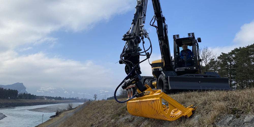 Am Standort Werkhof Trübbach wurde dem Rheinunternehmen Anfang März ein neuer Mobilbagger übergeben, welcher unter anderem für die Grünpflege eingesetzt wird. Das Fahrzeug der Marke Mecalac ermöglicht künftig die besonders schonende und ökologische Böschungspflege mit dem über vier Meter breiten Mähkorb.