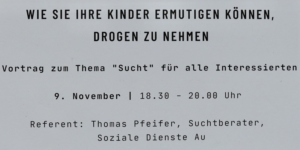 Wie bitte? Kinder ermutigen, Drogen zu nehmen? Das kann ja wohl nicht wirklich wahr sein. Referent dieses Vortrags sollte Thomas Pfeifer von den Sozialen Diensten in Au sein. Rheintal24 hat natürlich sofort Kontakt mit ihm aufgenommen, nachdem uns ein aufmerksamer Leser auf dieses seltsame Vortragsangebot aufmerksam gemacht hatte.