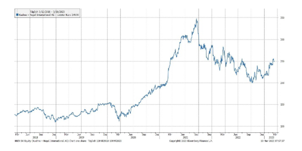 «Kühne + Nagel ist eines der weltweit grössten Transportunternehmen. Der Konzern hat Anfang März sehr starke Zahlen für das Geschäftsjahr 2022 gemeldet. So konnte Kühne + Nagel den Jahresumsatz um 20% auf CHF 39.40 Mrd. steigern. In der Folge verbesserten sich auch die Gewinnzahlen markant. Der operative Gewinn erhöhte sich um 28% auf CHF 3.76 Mrd. und der Reingewinn um 30% auf CHF 2.81 Mrd. Im Gesamtjahr profitierte Kühne + Nagel von den Lieferkettenproblemen der letzten Zeit. Ausserdem haben alle Geschäftsbereiche zum Unternehmenserfolg beigetragen. Insbesondere bei der Seefracht konnte mit +37% ein Rekordumsatz verzeichnet werden.