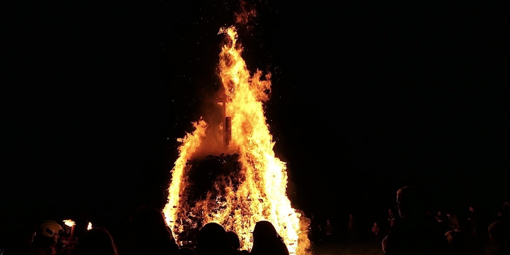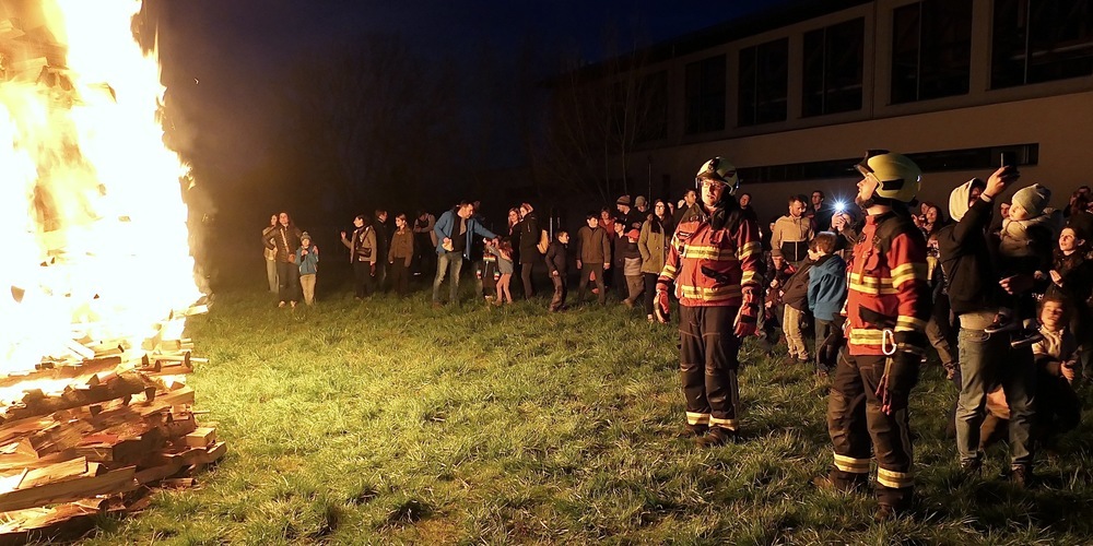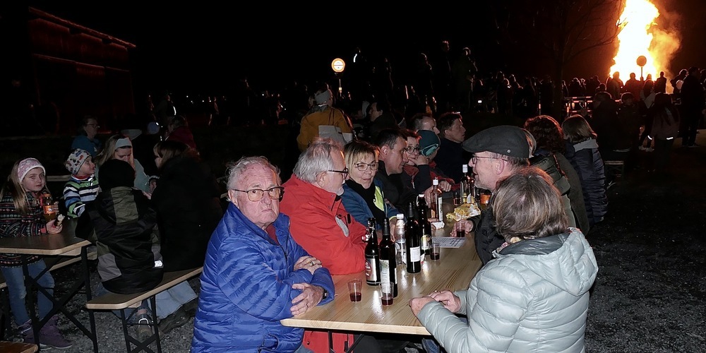 Als der Funken, der von Benjamin Gerber und Patrick Metzler unter der Leitung von Jakob Ritz fachkundig aus trockenem Brennholz errichtet worden war, entzündet wurde, schoss bald eine mächtige Flamme in den inzwischen dunklen Himmel empor.
