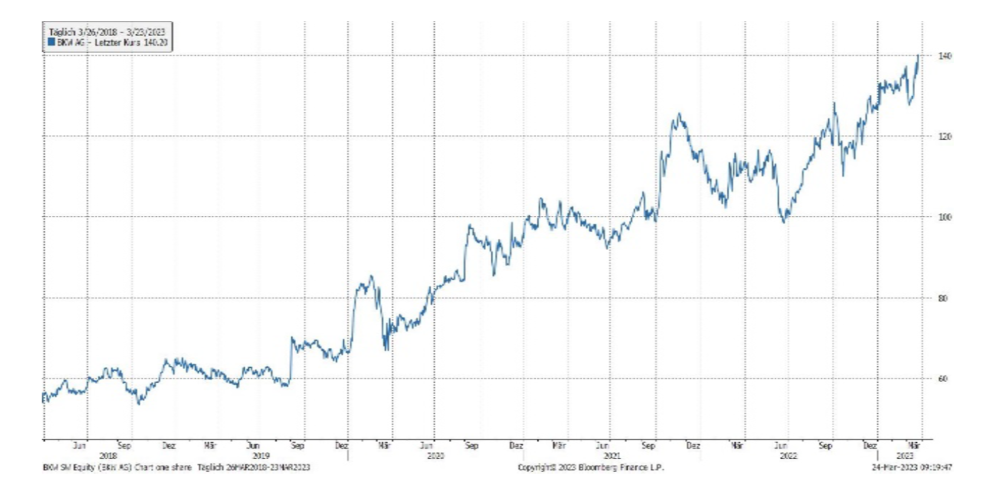 Kurs am 23.03.2023 CHF 140.20; 52 Wo Hoch/Tief CHF 140.40/96.70; Valor 13.029.366; Geschätztes KGV 2023: 19.15x; Dividendenrendite ca. 2.22%.