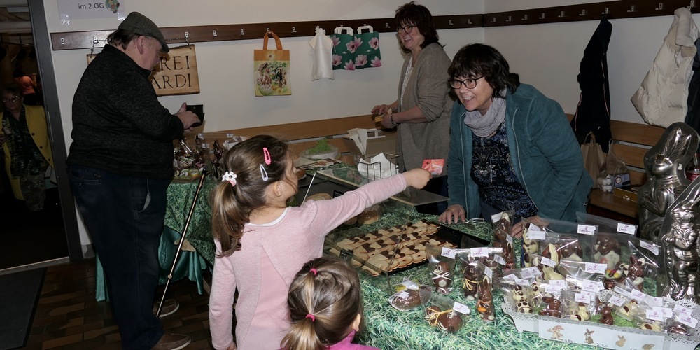 In welchem sich auch ein Stand der lokalen Bäckerei Lombardi fand. Mit Ostergebäck und Schokohasen. Die sich auch prächtig verkauften. Vor allem die Kinder liessen sich von der süssen Nascherei sofort faszinieren und drängten Grosi oder Opa zum Kauf.