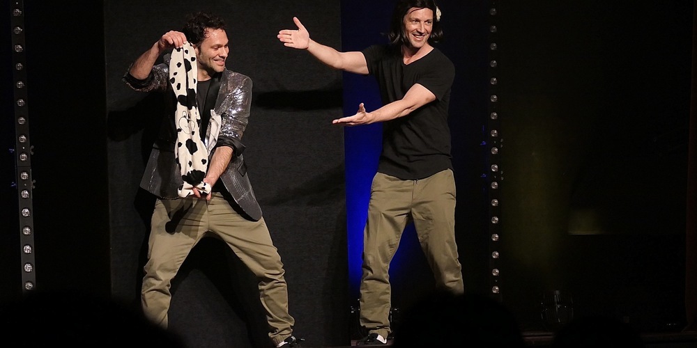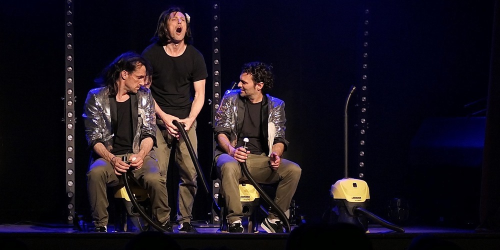 So gleich zu Beginn der Vorstellung, wenn die drei Akteure wie Fallschirmspringer auf die Bühne fliegen und in ihren aufgeblähten Seidenanzügen einen skurillen Tanz aufführen. Kann man nicht erklären. Das muss man gesehen haben, weshalb Ihnen die Videos in diesem Artikel ans Herz gelegt werden.