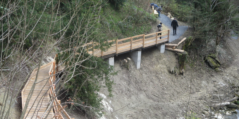 Wanderinnen, Wanderer und Naturfreunde freuen sich über den wildromantischen Weg, der das Rutschgebiet mittels verschiedener Kunstbauten traversiert.