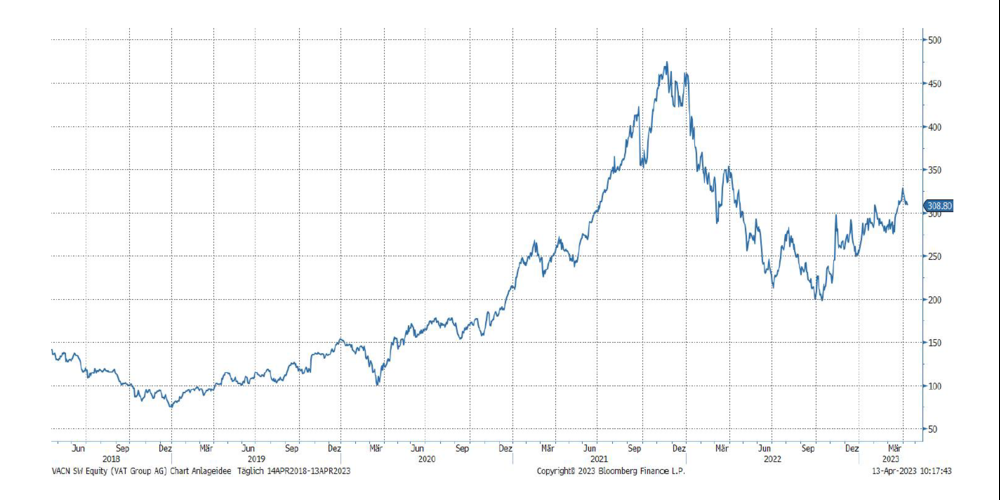 «VAT ist ein weltweit tätiges Unternehmen in der Entwicklung und Herstellung von Vakuumventilen, Mehrventilmodulen und Metallbälgen. VAT hat im 1. Quartal 2023 deutlich weniger Umsatz erwirtschaftet, lag jedoch mit CHF 232.7 Mio. (-11.5%) leicht über der eigenen Prognose. Noch deutlicher ging der Auftragseingang zurück. Er verringerte sich um 53.6% auf CHF 136.4 Mio., was mit dem Rückgang im Halbleitersegment einhergeht. Während die Verkäufe im Halbleitersegment rückläufig waren, konnte VAT im Bereich Advanced Industrials zulegen und auch im Dienstleistungsgeschäft die Umsätze leicht steigern.