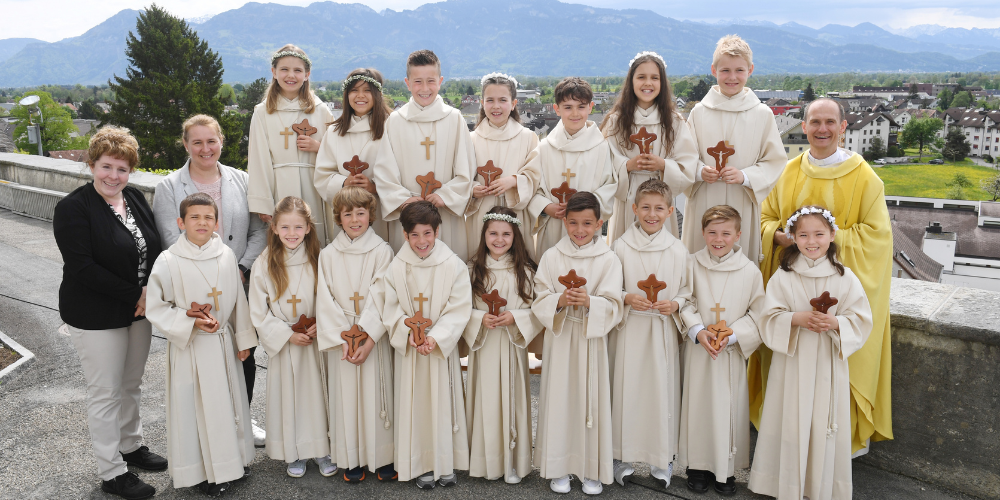 Die Musikgesellschaft begleitete die Kinderschar in einer feierlichen Prozession vom Schulhaus Berg zur Kirche. Dort angekommen durften die Kinder, in die vom Messmerteam geschmückte Kirche einziehen.