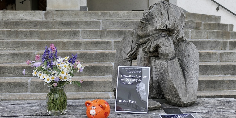 Derzeit beschäftigt sich «Toni» in seinen hölzernen Gedanken vermutlich mit der Gemeindepräsidentenwahl in Berneck. Drei Kandidaten bewerben sich um den durch den Wechsel von Bruno Seelos nach Widnau frei gewordenen Sitz im Rathaus. Nach der grossen öffentlichen Vorstellung am vergangenen Dienstag in der MZH Bünt bestand am späten Freitagnachmittag die Möglichkeit, bei einem Glas Wein in kleiner Runde beim «Toni» mit den Kandidaten zu sprechen.