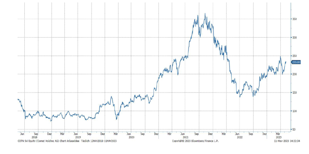 «Comet bietet Komponente, Module, Systeme und Dienstleistungen für die Röntgen- und Hochfrequenztechnologie an. Comet hat im 1. Quartal 2023 unter der Schwäche im Halbleitermarkt gelitten. Der Umsatz sank um 13.9% auf CHF 107.5 Mio. Für 2023 erwartet das Unternehmen weniger Umsatz und eine tiefere Marge. Die langfristigen Wachstumsaussichten schätzt Comet aber unverändert positiv ein. Diese sind zum einen getrieben von der generell steigenden Nachfrage nach Produktionskapazitäten für Mikrochips, zum anderen von neuen Anwendungen und Technologien, die eine immer höhere Nachfrage nach immer komplexeren Halbleiterbauelementen auslösen.