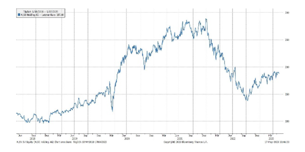 Kurs am 17.05.2023 CHF 186.60; 52 Wo Hoch/Tief CHF 206.50/137.80; Valor 2.459.027; Geschätztes KGV 2023: 15.20x; Dividendenrendite ca. 2.49%.