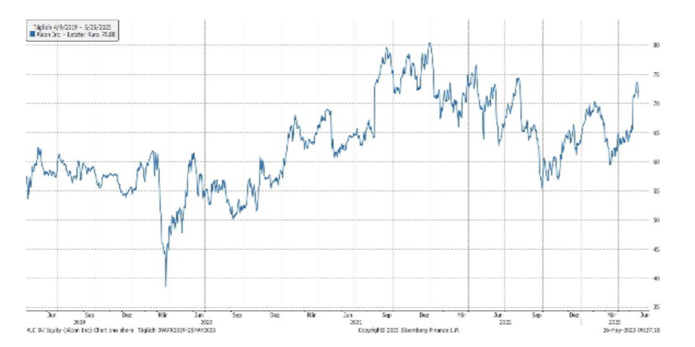 «Alcon entstand als Spin-off von Novartis und ist im Swiss Market Index SMI vertreten. Das weltweit tätige Unternehmen stellt Produkte zur Behandlung von Augenerkrankungen her. Das Spektrum reicht dabei von einfachen Kontaktlinsen bis hin zu komplexen chirurgischen Produkten. Im 1. Quartal 2023 legte Alcon sowohl beim Umsatz als auch beim Reingewinn klar zu. Der Umsatz stieg im 1. Quartal um 7.3% auf CHF 2.33 Mrd. Die operative Marge kam bei 11.5% zu liegen. Unter dem Strich schrieb das Unternehmen einen Reingewinn von USD 174 Mio. Mit den erzielten Zahlen wurden die Erwartungen der Analysten auf allen Ebenen übertroffen.