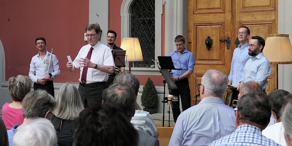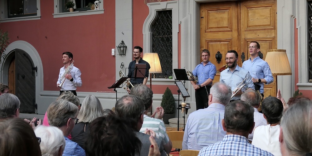 In dieser schönen Atmosphäre veranstaltete die Rheintalische Gesellschaft für Musik und Literatur (RGML) am Samstagabend die traditionell gewordene Löwenhofserenade. Mit der Bläsergruppe «PrimeBrass», bestehend aus den beiden Trompetenspielern Guillaume Thoraval und Markus Graf, Roman Flumet mit dem Waldhorn, Sebastian Koelman mit seiner Posaune und Henrique Dos Santos Costa mit der Tuba.