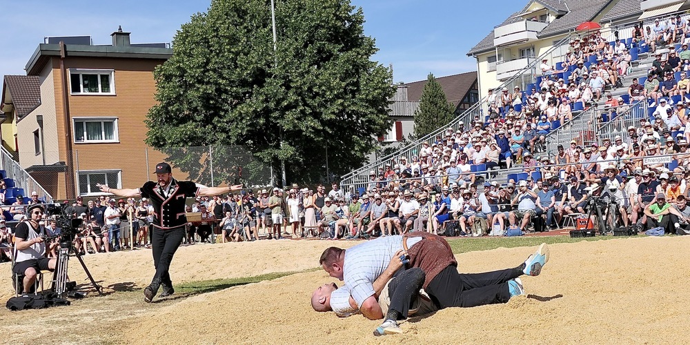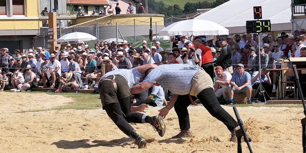 Einem Nichtschweizer muss ein solches kantonales Schwingfest ja als höchst seltsame Erscheinung vorkommen. Die Sportler tragen Hosen, die an Windelhosen erinnern, klopfen sich gegenseitig das Sägemehl vom Rücken, und im Hintergrund laufen den ganzen Wettbewerbstag Jodelgesänge über die Lautsprecher. Unterbrochen vom Alphornquartett Oberegg und zwei Fahnenschwingern.