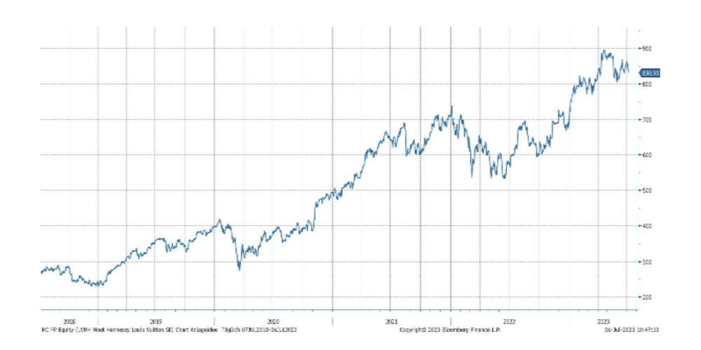 «LVMH ist der weltweite Branchenführer in der Luxusgüterindustrie. Sie produzieren und verkaufen u.a. Wein, Cognac, Parfüm, Kosmetika, Reisegepäck, Armbanduhren und Schmuck. LVMH präsentierte einen starken Jahresstart. Gute Geschäfte mit Leder und Mode haben LVMH einen Umsatz im 1. Quartal 2023 von EUR 21.04 Mrd. (+17%) beschert. Der Quartalsumsatz übertraf die Analystenerwartungen um mehr als EUR 1 Mrd. Der Erlös des Segments "Mode & Lederwaren" fiel mit EUR 10.7 Mrd. rund 18% höher aus als im Vorjahr. Die Luxusbranche profitiert insbesondere von der Wiedereröffnung des chinesischen Marktes.