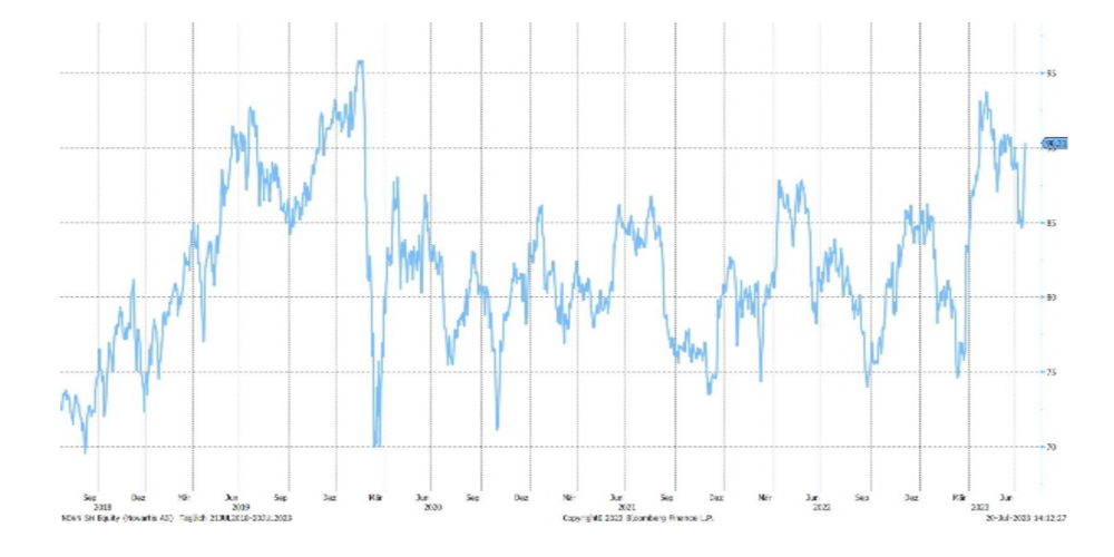 Kurs am 20.07.2023 CHF 90.95; 52 Wo Hoch/Tief CHF 93.95/73.32; Valor 1.200.526; Geschätztes KGV 2024: 15.54x; Dividendenrendite ca. 3.39%.