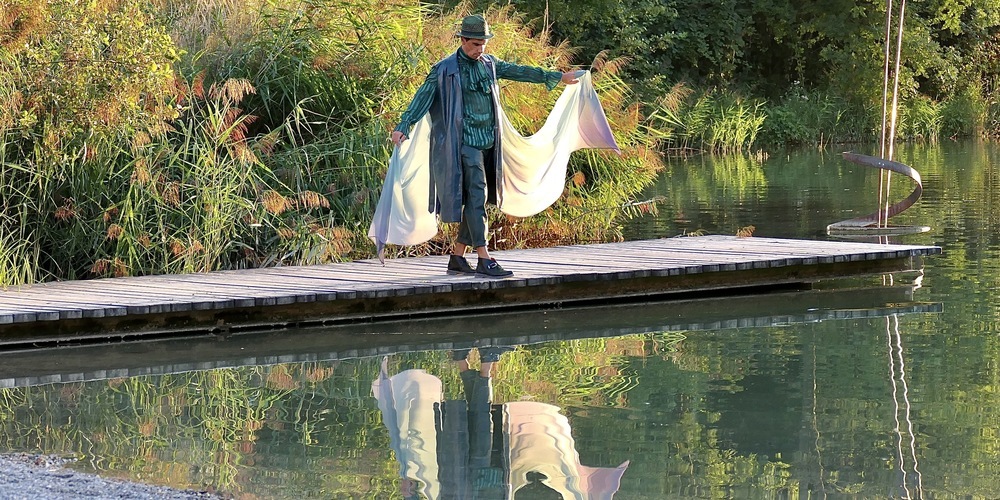 Sie kündigten das von Heidi Salmhofer geschriebene und inszenierte humorvolle und auch traurige Theaterstück «Die Korrektur eines Tunichtguts» an, das an diesem Abend uraufgeführt wurde. Schon bei diesen einleitenden Worten war im Hintergrund am Ufer des Alten Rheins eine geheimnisvolle, in Grau-Grün gewandete Figur zu sehen, die die Arme in Wellenbewegungen schwenkte und Kieselsteine ins Wasser warf. Nämlich der von Stefan Bösch fulminant dargestellte «Rhein».