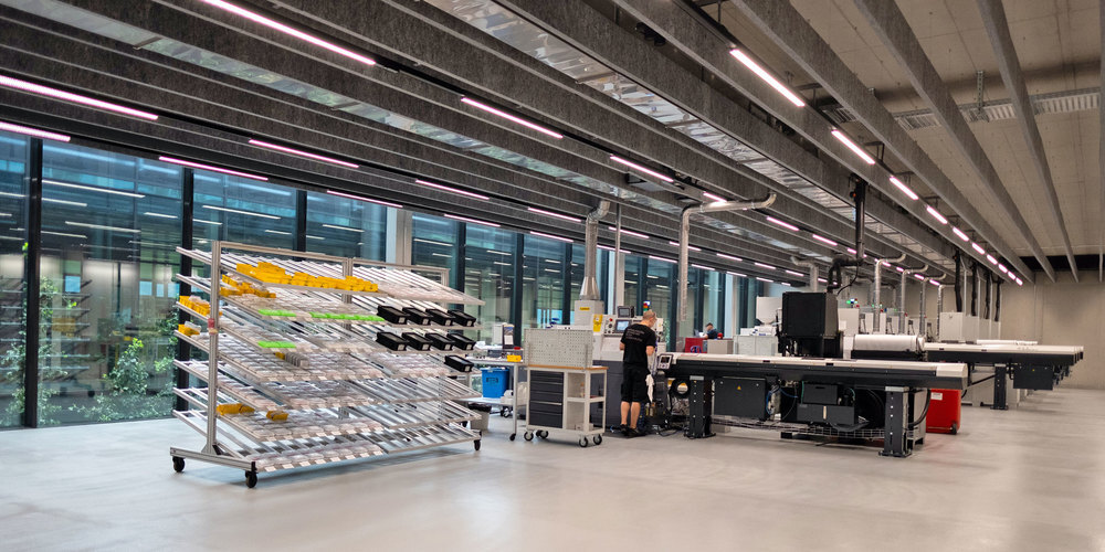Die Integration eines vollautomatisierten Lagerverwaltungssystems revolutioniert das bisherige Bestandsmanagement. Mit 2400 Behältern und einem 14 Meter hohen Hochregallager ermöglicht das System eine optimale Lagerung und schnellen Zugriff auf Materialien und Komponenten. Darüber hinaus wurden verschiedene Abteilungen innerhalb der Organisation zusammengeführt, um die Kommunikationswege zu optimieren und die Effizienz weiter zu steigern. Die 1. Etage des Gebäudes umfasst nun das Lager, die Logistik und den erweiterten Reinraum.