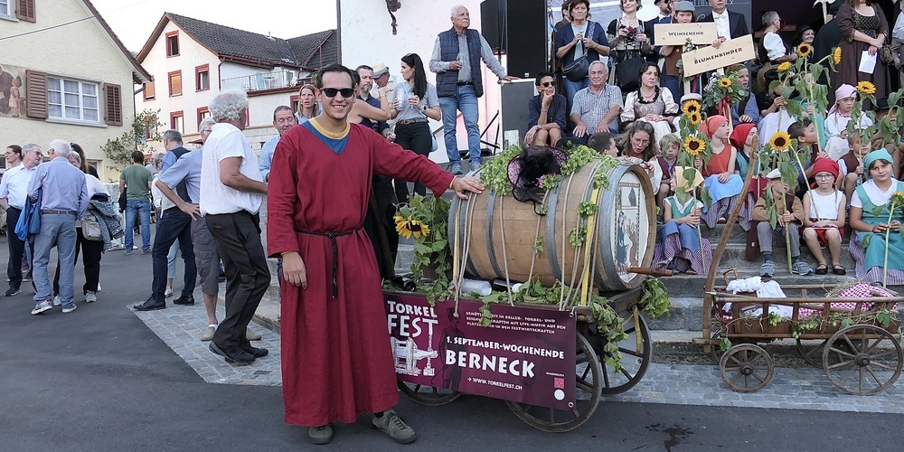 Wie von den letzten 23 (!) Torkelfesten gewohnt, war auch der Bernecker Nachtwächter Felix Indermaur berufen, eine «Bekanntmachung» anlässlich des Festanlasses an die vielen Besucher zu richten. Wie gewohnt sprach er in Versform ein Lob auf den Wein und das gute Leben und begrüsste alle Freunde des Bernecker Weins von Nah und Fern.
