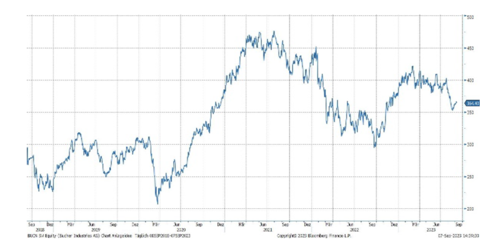«Bucher Industries AG ist ein international tätiges Schweizer Unternehmen in der Maschinenindustrie. Die Gruppe besteht aus den Bereichen Kuhn Group (Spezialisierte Landmaschinen), Bucher Municipal (Kommunalfahrzeuge), Bucher Specials (Bucher Vaslin, Bucher Landtechnik etc.), Bucher Hydraulics (Hydraulik-Komponenten) und Emhart Glass. Im 1. Halbjahr 2023 stieg der Umsatz um 9.1% auf CHF 1.94 Mrd. Der höhere Umsatz schlug sich auch im operativen Gewinn nieder. So stieg das Betriebsergebnis um 21% auf CHF 246 Mio. Der Auftragseingang hingegen reduzierte sich um 15.7% auf CHF 1.59 Mrd. Die Nachfrage ist von einem Höchstniveau im Jahr 2022 im Rahmen der allgemeinen konjunkturellen Abschwächung im 1. Semester zurückgegangen.
