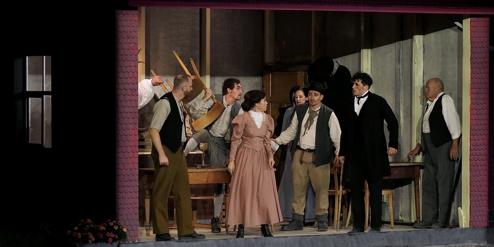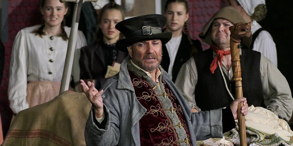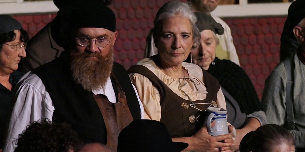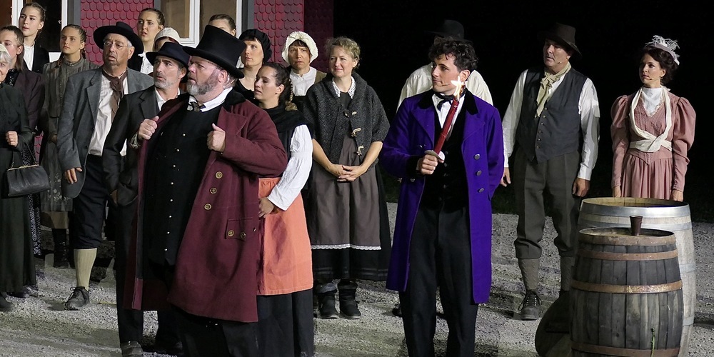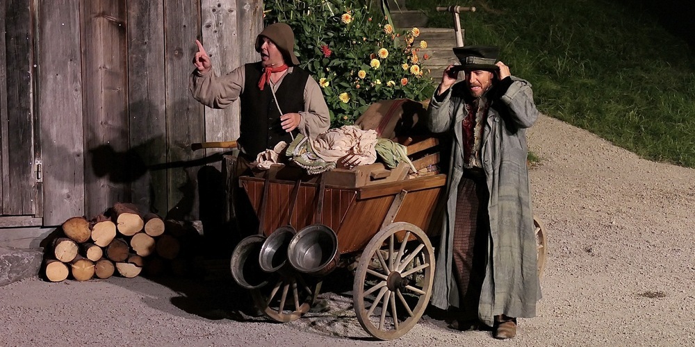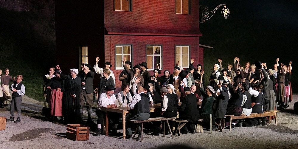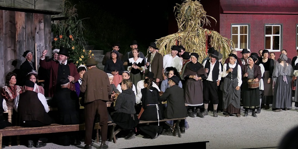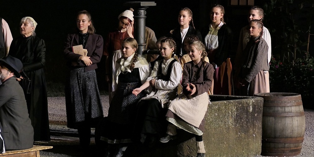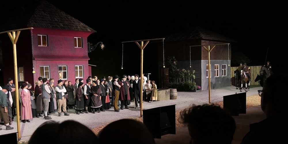 Eindrücklich und grossartig war das Bühnenbild. Was das Bauteam der Freilichtbühne Rüthi da auf den Platz gezaubert hat, muss keinen Vergleich scheuen. Ein kleines Dorf ist auf der freien Spielfläche entstanden. Mit Häusern, deren Fassaden nach oben aufgezogen wurden, um dem Geschehnissen in der Dorfwirtschaft oder der Schule beiwohnen zu können. Mit einer pittoresken am Hang stehenden Kirche und mit einer Hintergrundlandschaft, die perfekt in das Spiel miteinbezogen wurde.