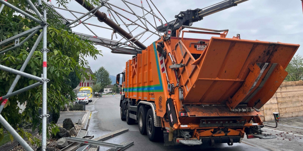 Ein 56-jähriger Mann fuhr mit seinem Abfallsammelfahrzeug auf der Feldstrasse Richtung Bahnhofstrasse. Beim Passieren einer temporären Fussgängerbrücke riss der auf dem Fahrzeug aufgesetzte Kran Teile der Überführung mit.