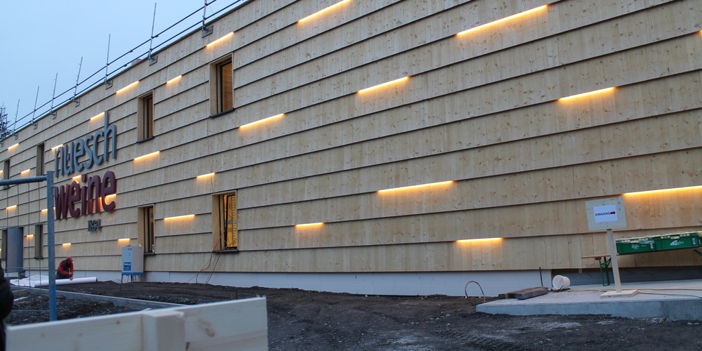 Was für ein Moment! Am Freitagabend konnte Nüesch Weine nach einjähriger Bauzeit, in der übrigens ausschliesslich einheimische Handwerksbetriebe beschäftigt wurden, das Aufrichtefest des neuen Firmensitzes feiern. Entstanden ist ein repräsentativer Holzbau, den die Rebsteiner Firma Schönauer AG entworfen und erstellt hat. Belegschaft, Planer: innen, Handwerker:innen und anderweitig am Neubau Beteiligte waren eingeladen, um auf die Fertigstellung des Rohbaus anzustossen – rund 90 Personen folgten der Einladung und kamen in den Genuss eines locker-sympathischen Wochenend-Feierabend-Anlasses.